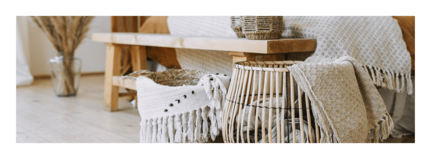 Materialen: rotan, gevlochten textiel, hout, aardewerk