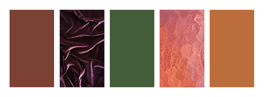 Kleuren: warm oker, terracotta, olijfgroen, dieppaars